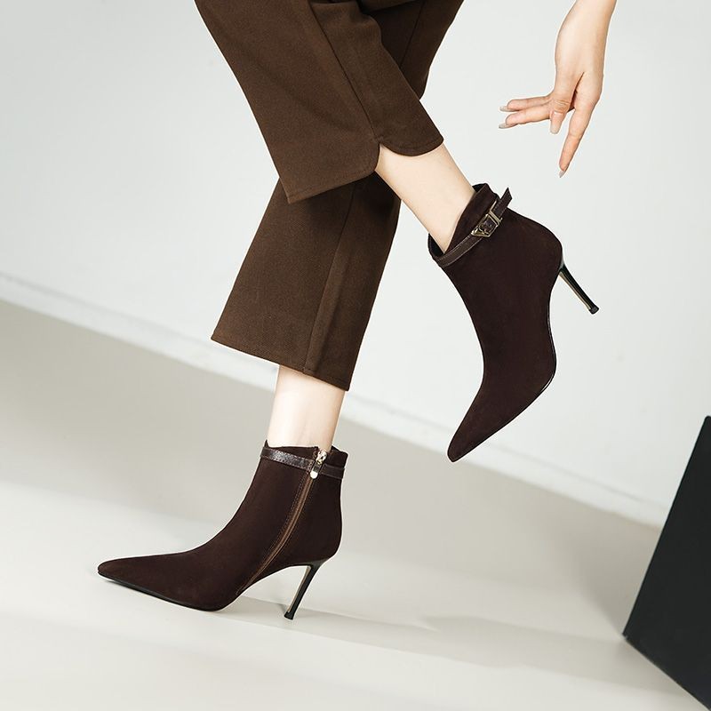 Soft leather version ~ Niche design pointy short boots for women thick heel belt buckle suede Chelsea boots slim Martin boots