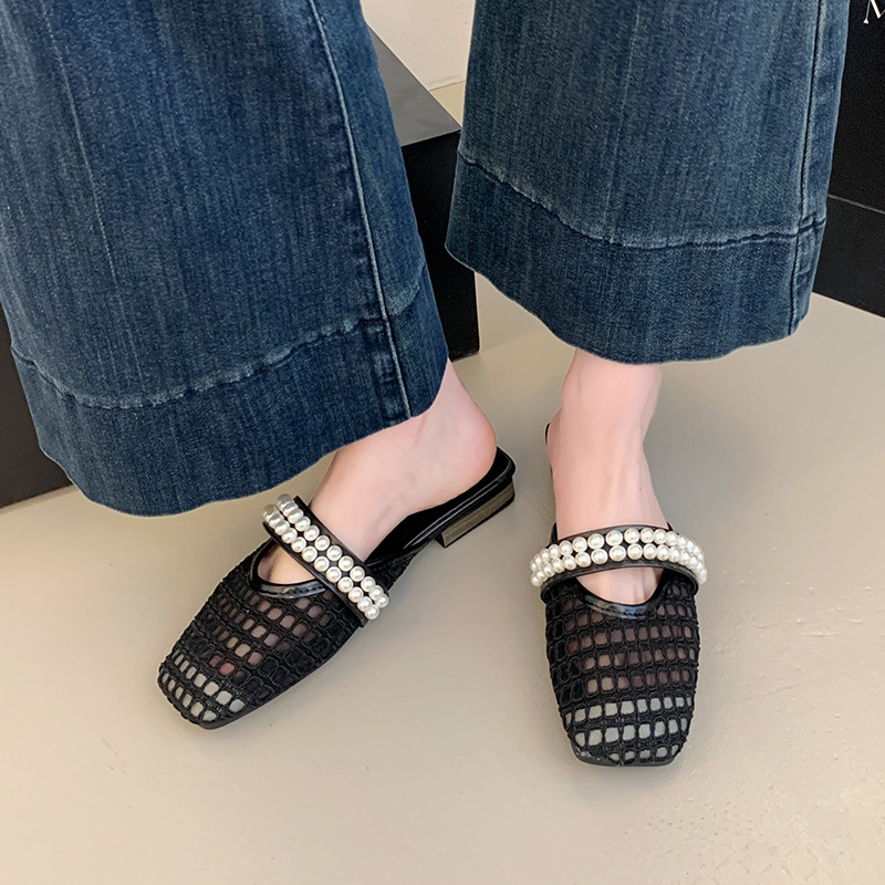 French mesh breathable half-slippers for women in summer wear with skirt sandals pointed toe low-heeled sandals