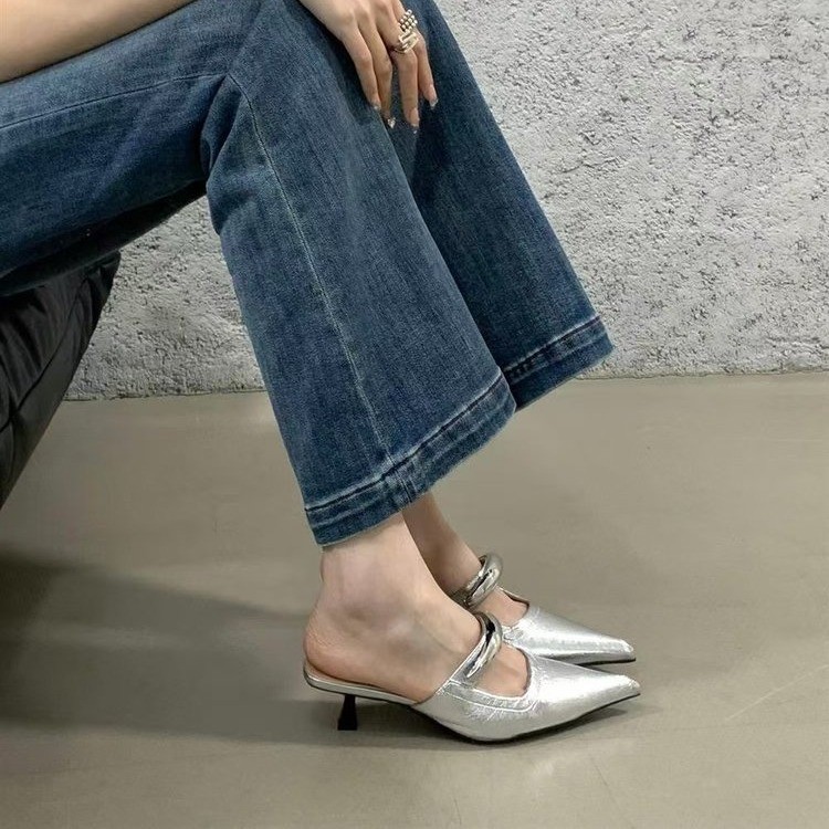 French pointed toe and thin heeled half slippers wearing slim sandals mules with shallow mouth and no tired feet for women