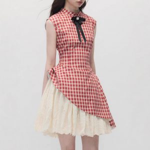 Strawberry cream pie, new Chinese style red plaid waist-hugging and slim small stand-up collar dress for women
