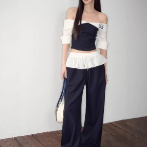 Original sporty pure contrasting one-shoulder top ruffled scimitar trousers suit pants