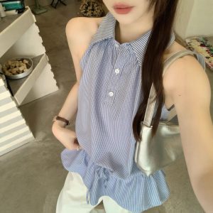 Real photos of summer Korean temperament plaid shirt top drawstring slimming and reducing age-reducing versatile loose-edged vest for women