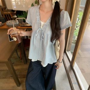 Real shot of summer necklace, lace-up, blue striped fake two-piece short-sleeved shirt