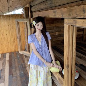 Real shot of retro blue grid design puff sleeve shirt for women in summer loose casual top