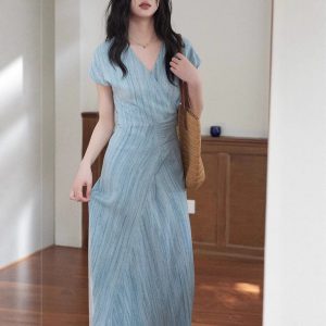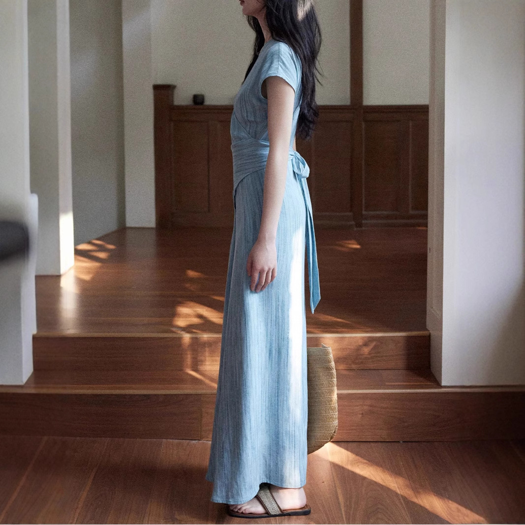 Eryang Design [Jinyan] imitation fried color texture short-sleeved dress for women commuting atmospheric and simple temperament long skirt