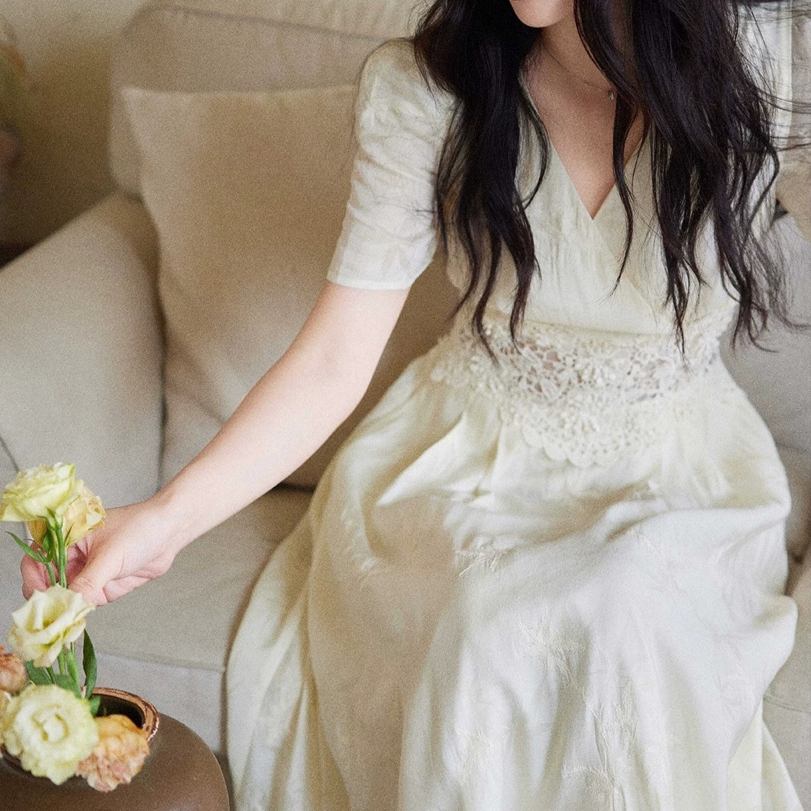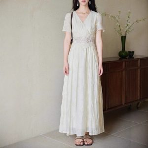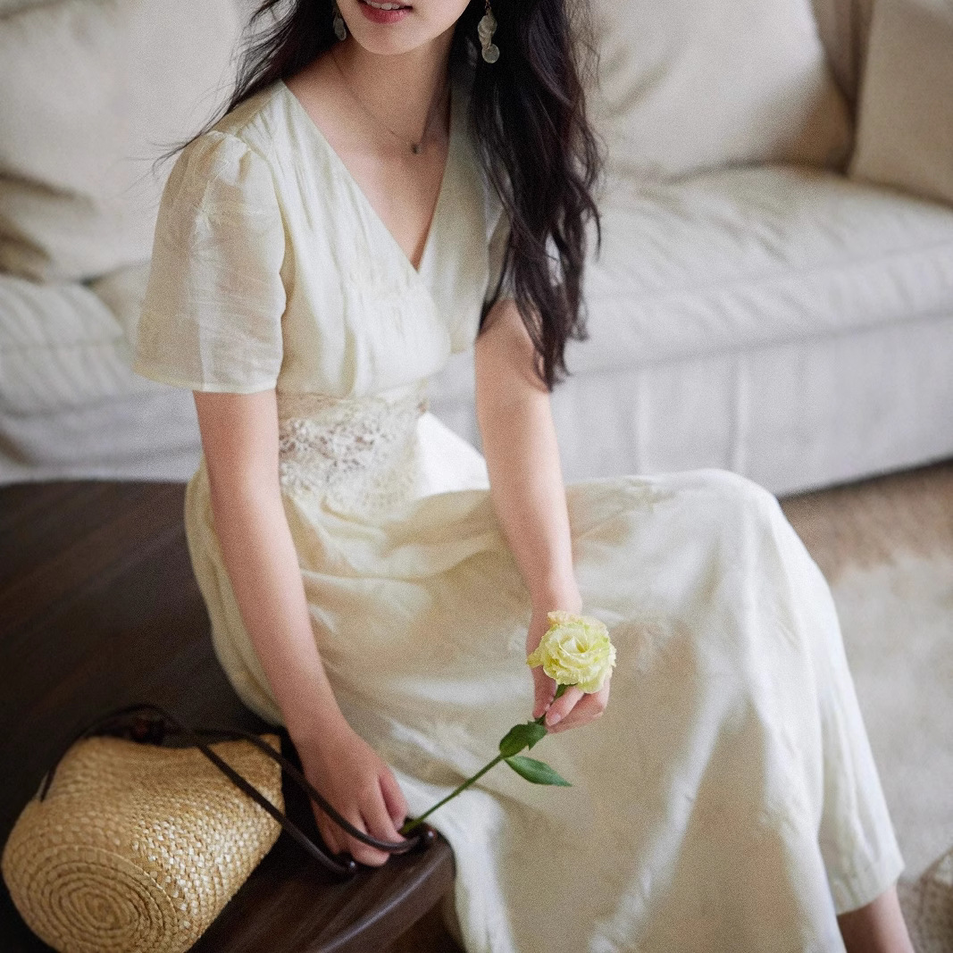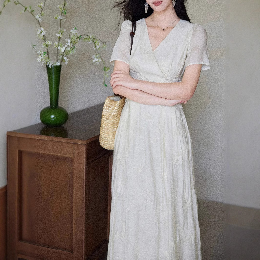 Eryang Design [Nanxi] Tiansi embroidered hollow lace splicing dress for women French retro style long skirt
