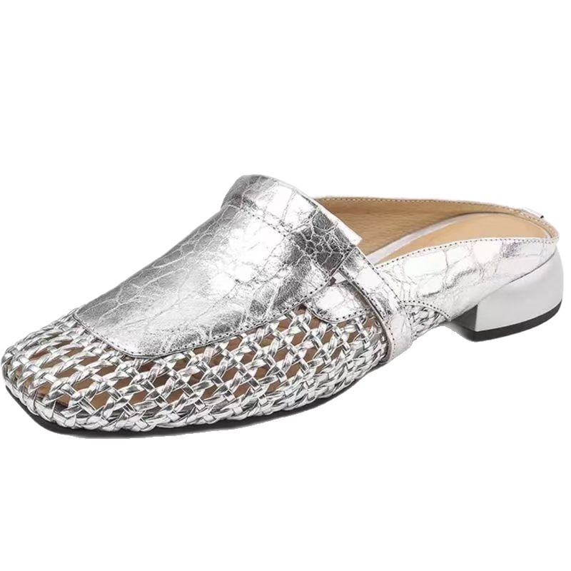 French retro square-toe hollow woven thick heel shoes for women with one foot, casual half slippers for women