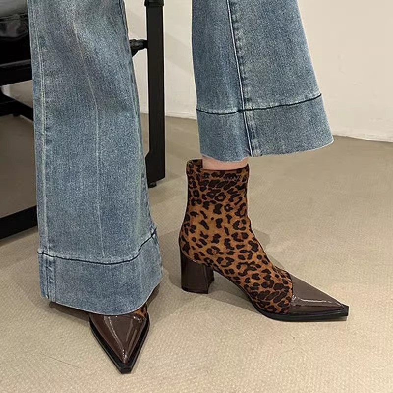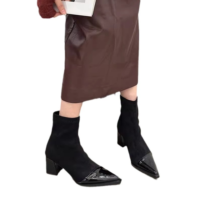 French slim elastic short boots for women in autumn and winter small fragrance style pointed toe thick heel thin boots for women high heels