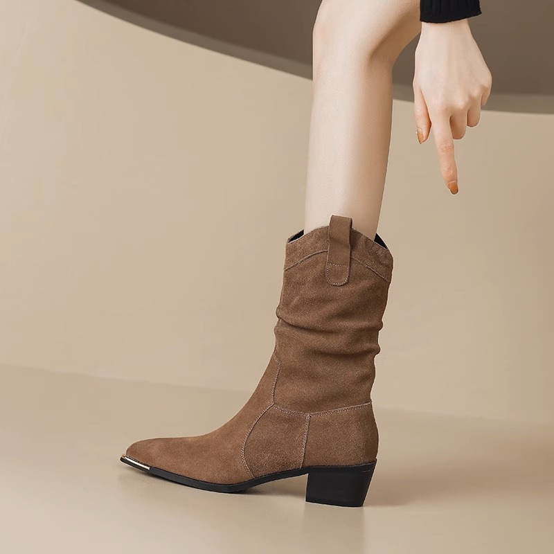 Frosted soft leather pile boots for women’s autumn and winter pointed toe knight boots thick heel retro western denim boots
