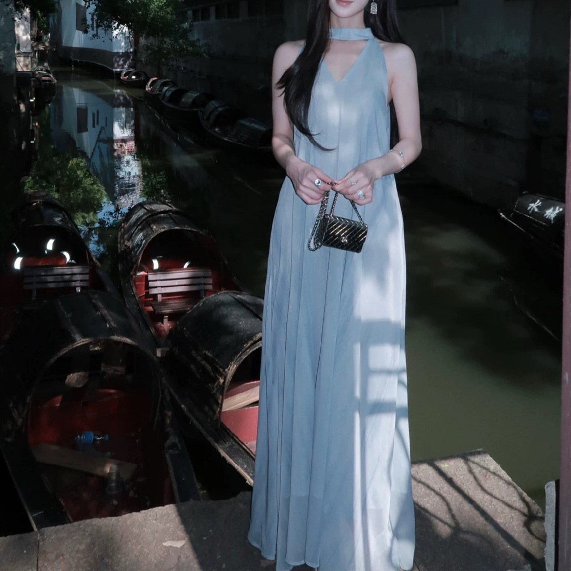 High-end style vacation style tulle neck halter dress for women’s summer vest long skirt