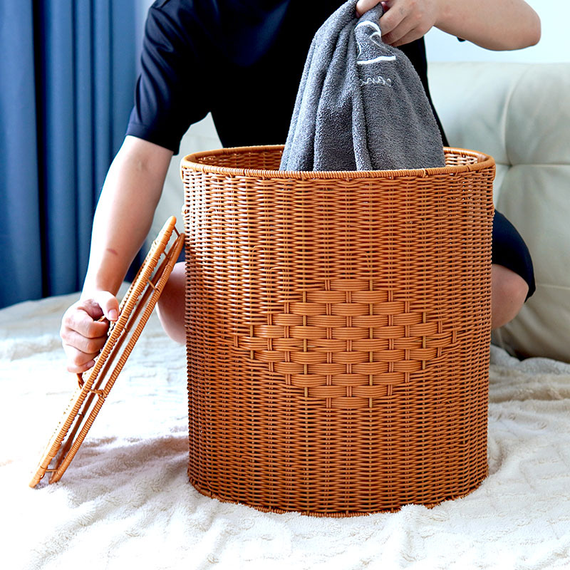 Imitation rattan woven round storage bucket with lid living room toys storage basket bedroom clothes storage basket dirty laundry basket