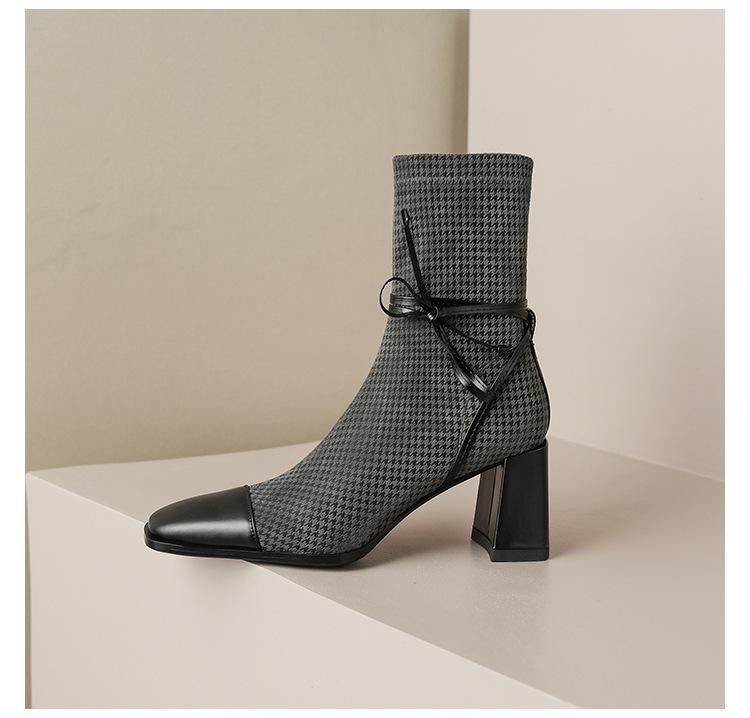 Kanaigu Temperament style ~ Square-toed houndstooth Martin boots for women with autumn bow thick high heels