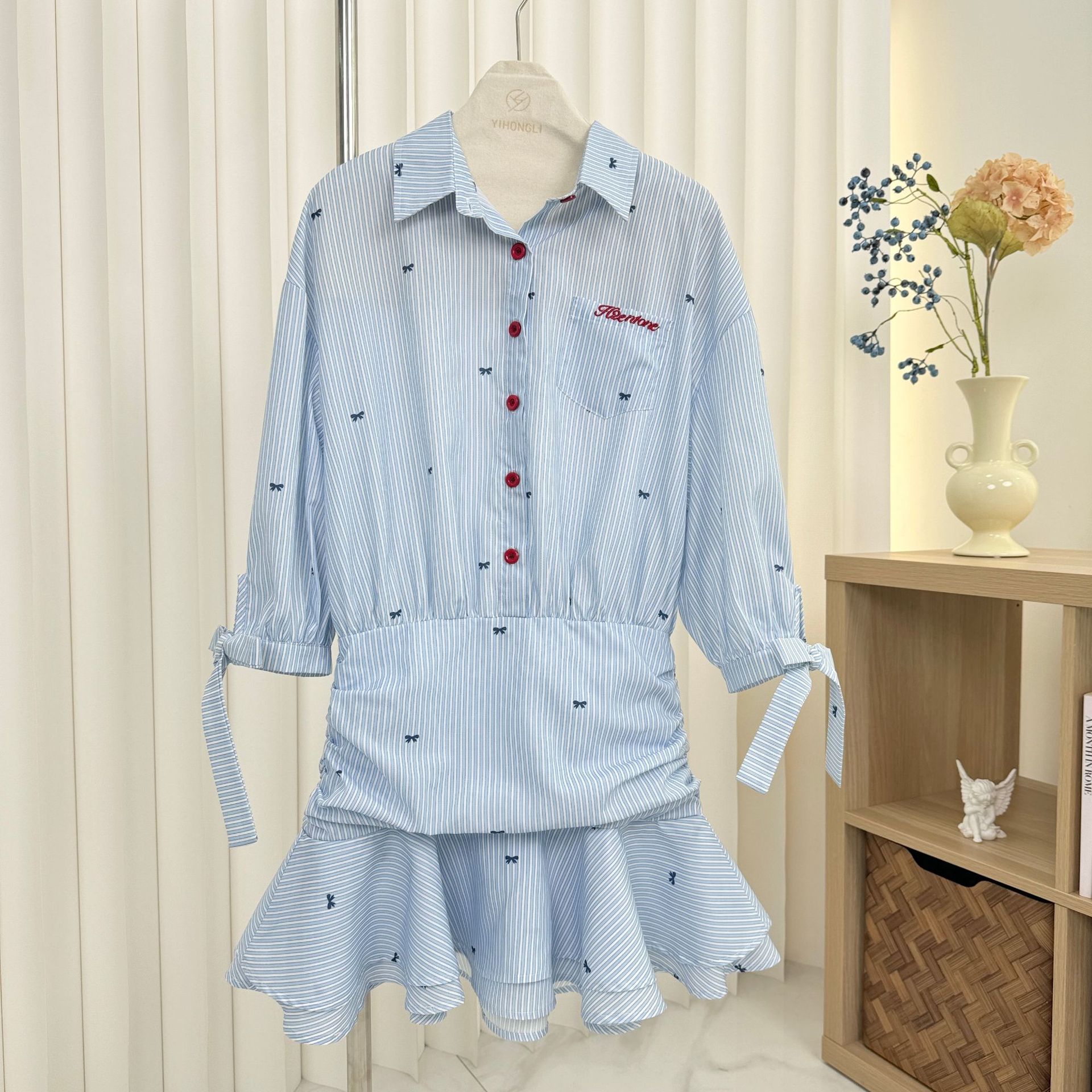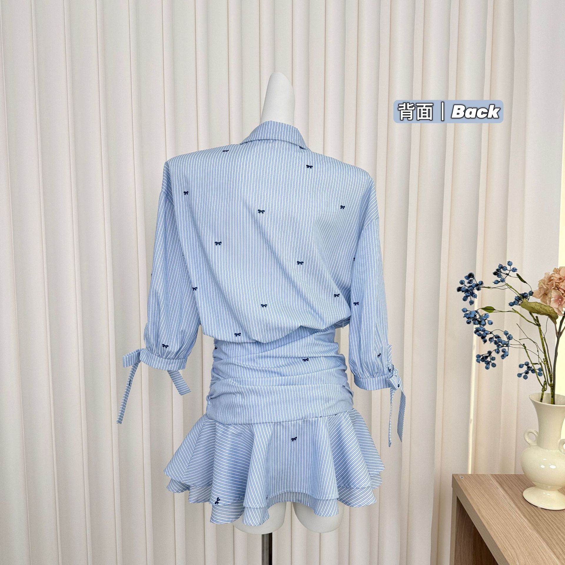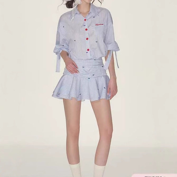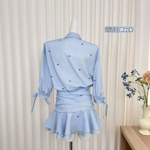 Lapel mid-sleeved waist-hugging shirt skirt blue and white striped dress ruffled pleated skirt