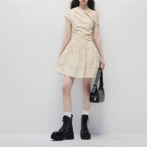 Original summer design and temperament, waist-hugging and slimming shoulder-shaped beige dress for women