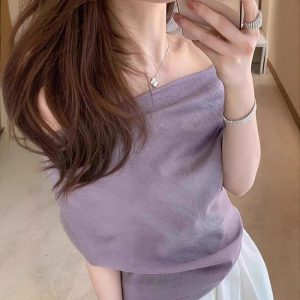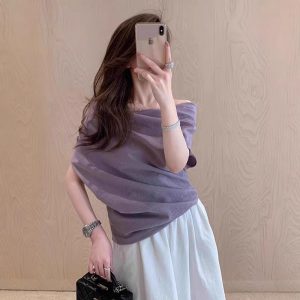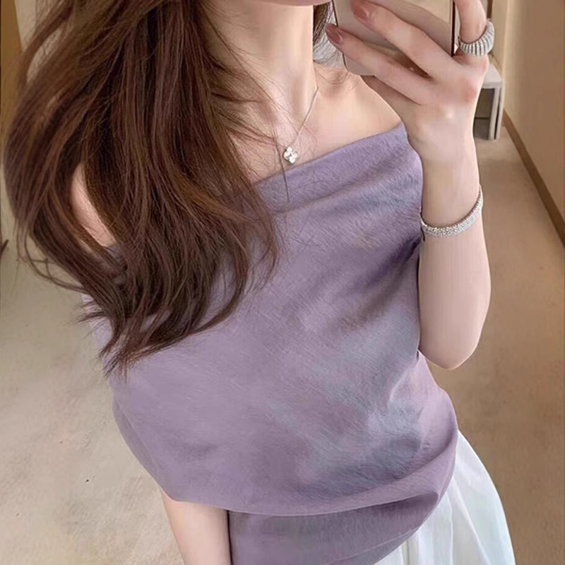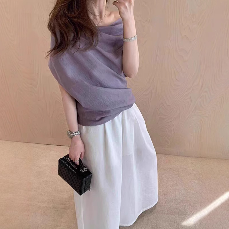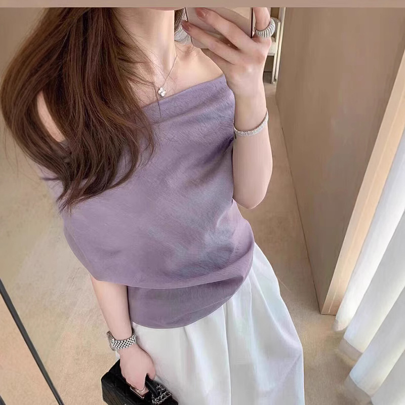 Purple top one shoulder short sleeves for women in summer irregular French large size atmosphere