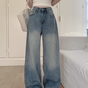 Real photo American retro lace splicing design wide-leg jeans women’s high waist slim floor trousers spring