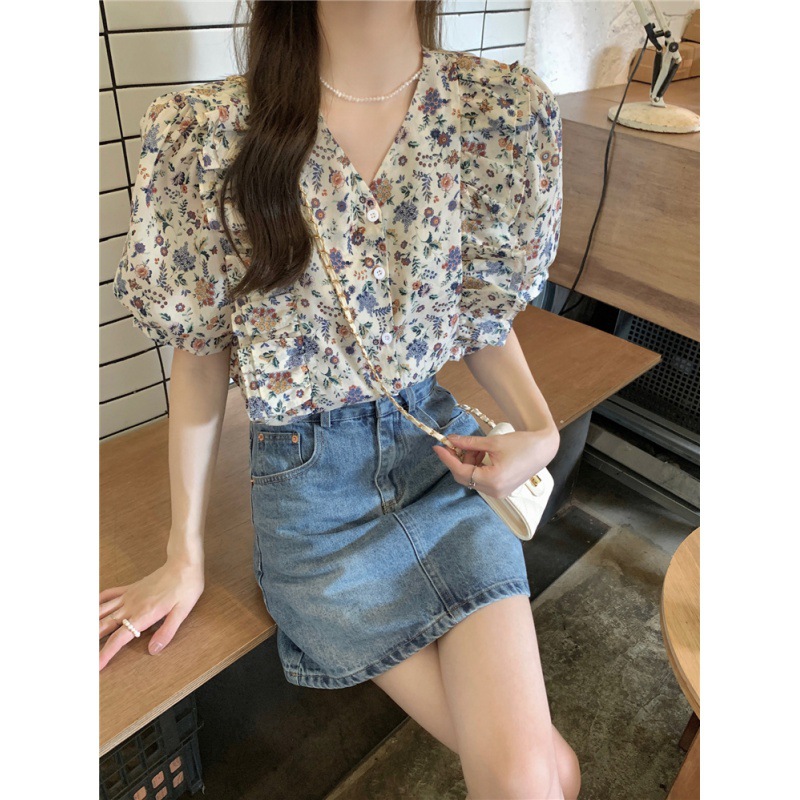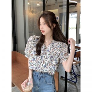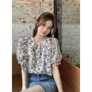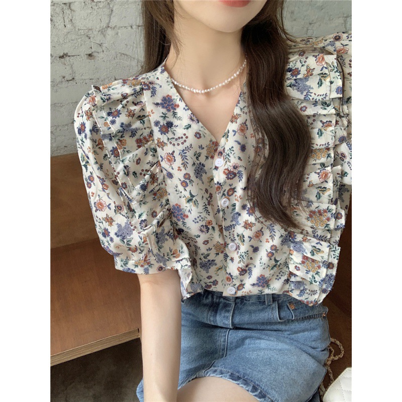 Real photo Korean collar design niche floral short-sleeved shirt for women in summer French retro sweet shirt