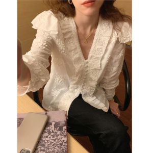 Real photo of embroidered lace spliced ​​long-sleeved shirt for women in spring and summer loose puff sleeve shirt