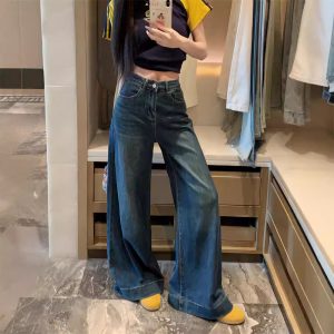Real photo of summer American black wide-leg pants split jeans retro washing and old-top pants design