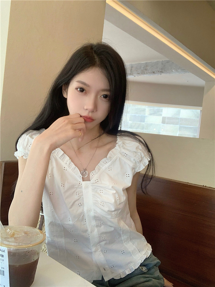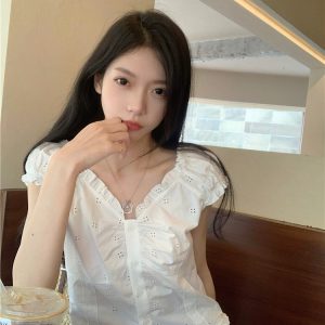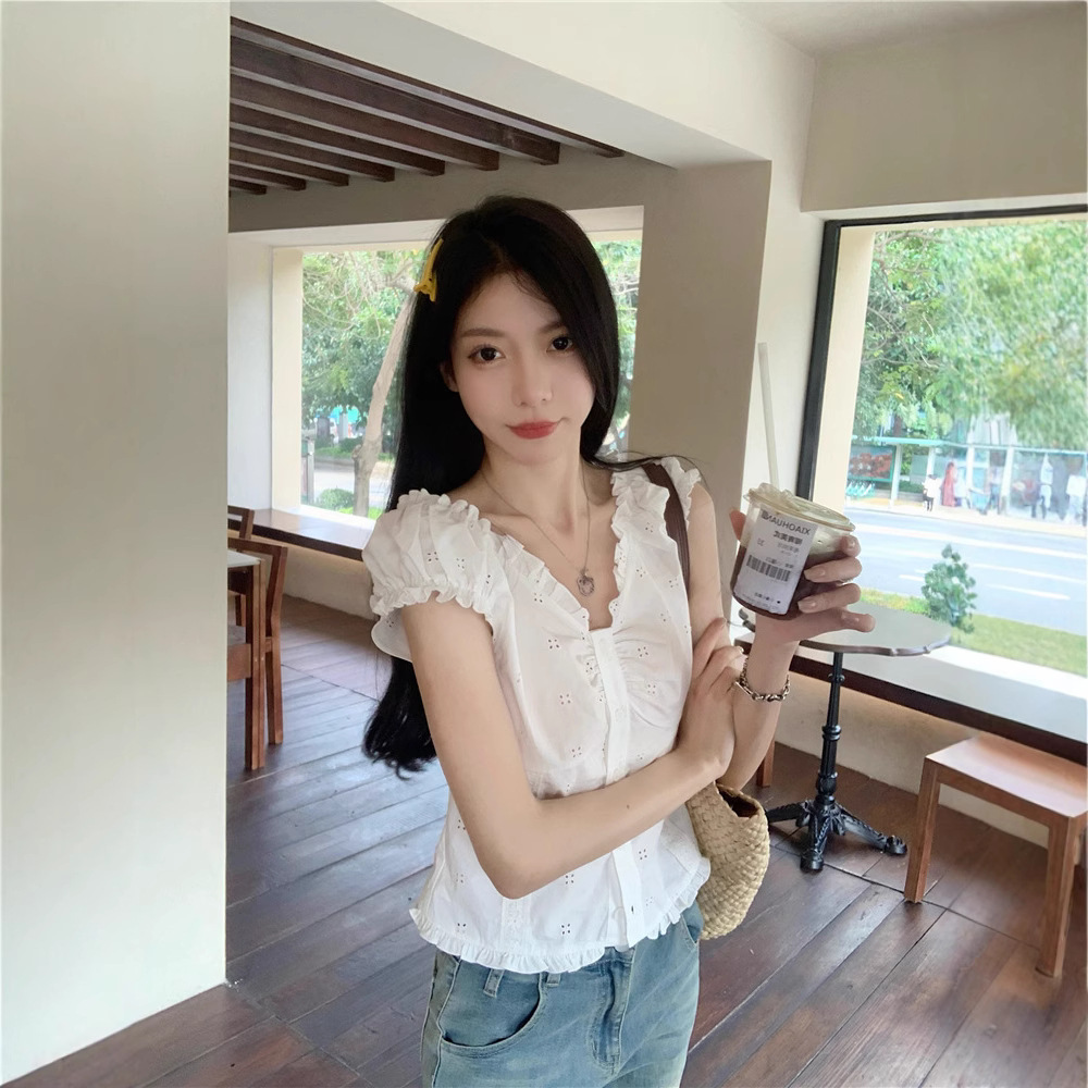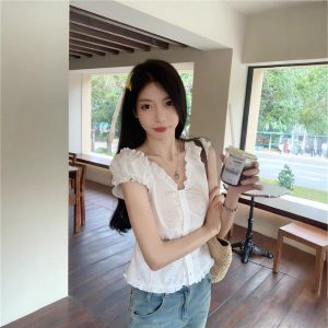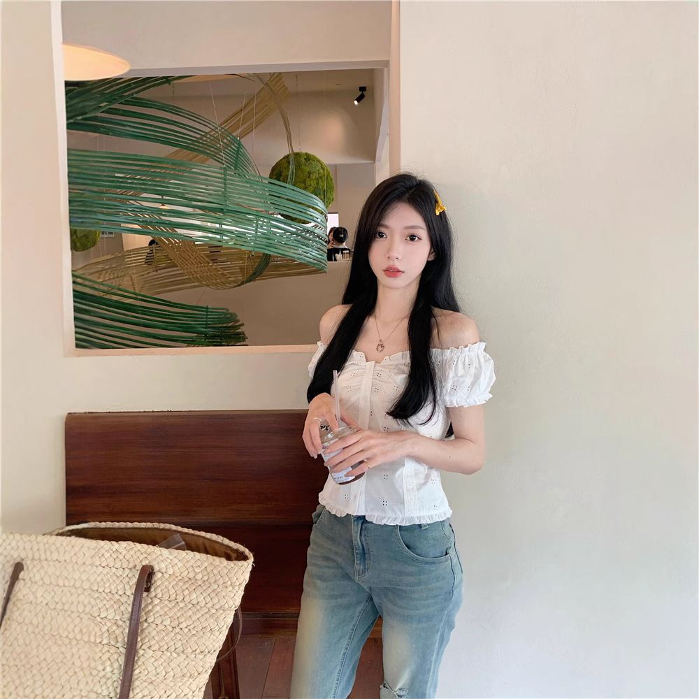 Real photo of summer off-white shirt for women puff sleeve collar one shoulder lace waist-hugging shirt short top