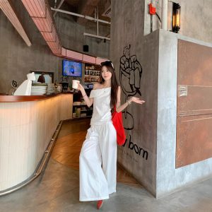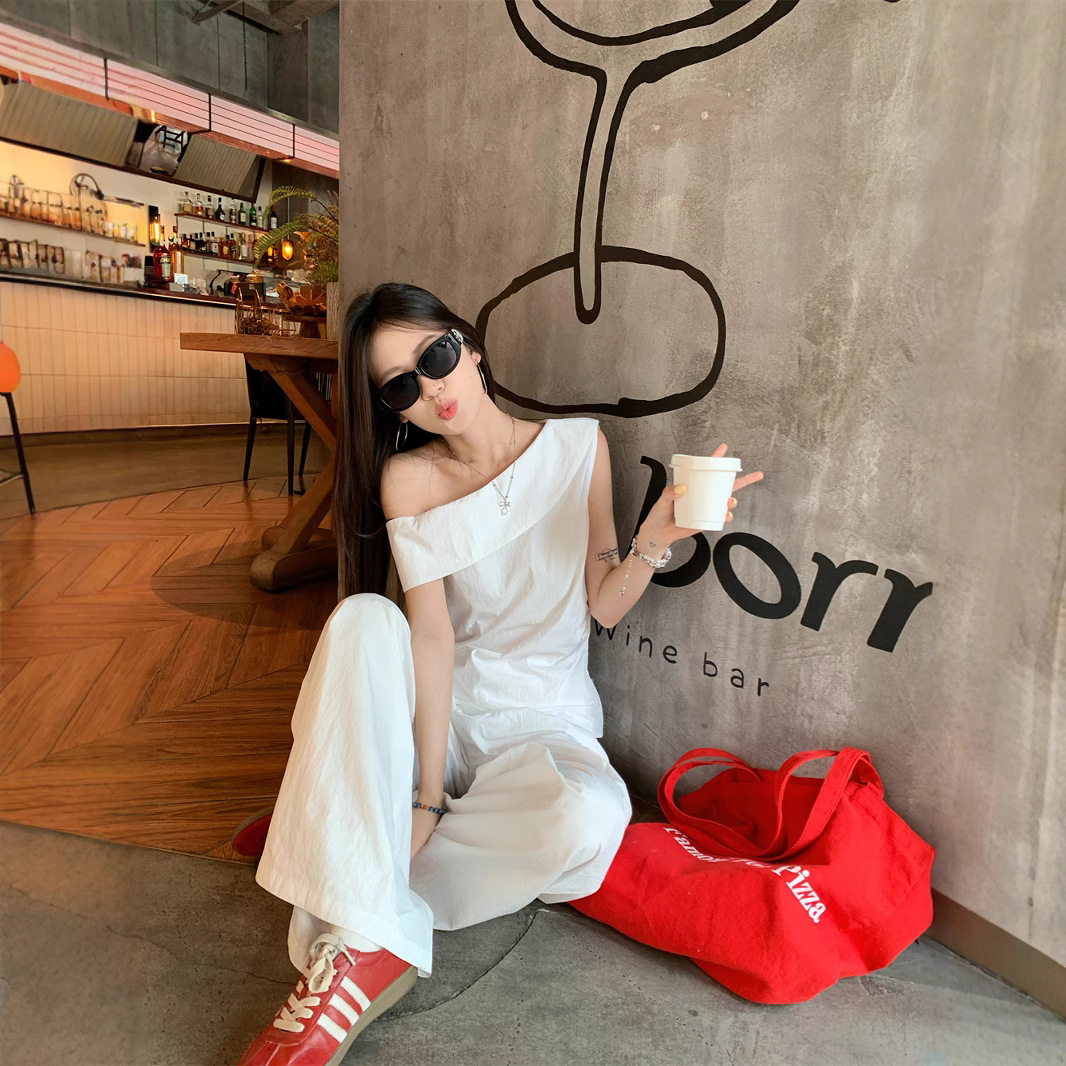Real photos of summer casual, versatile and fashionable niche design, off-shoulder sleeveless top and pants set