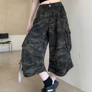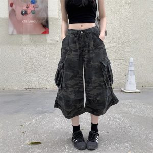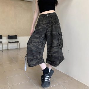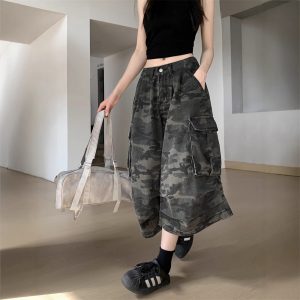 Real shot of American retro camouflage denim cropped pants for women in summer hot girls high waist loose work shorts