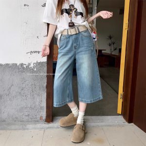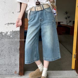 Real shot of American retro high street denim trousers for women in summer high waist ripped wide-leg trousers
