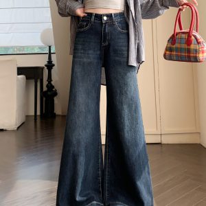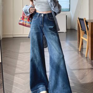 Real shot of Hong Kong style retro elastic wide-leg swaying jeans women’s high waist temperament trousers long trousers