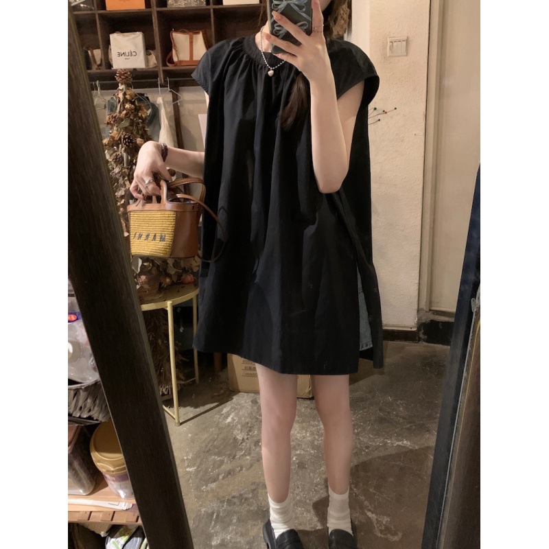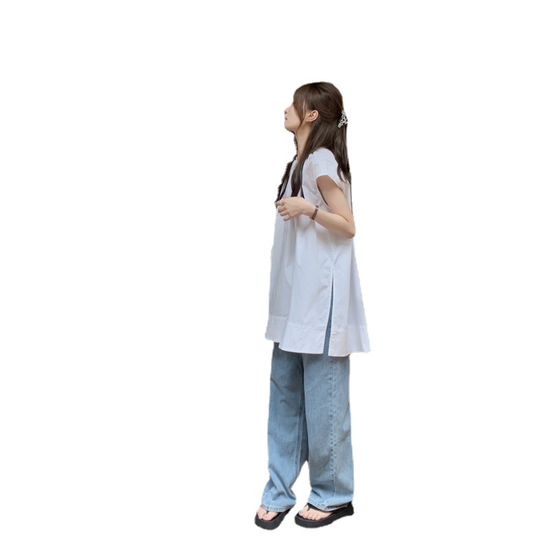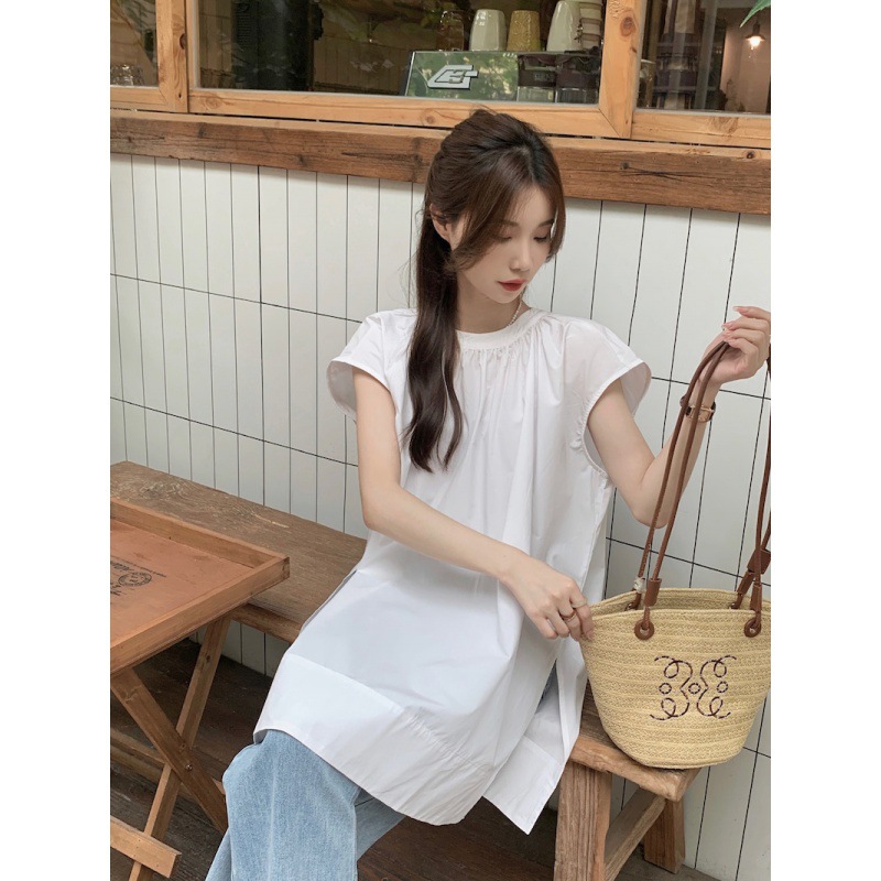 Real shot of summer French retro simple white loose temperament niche sleeveless slit shirt women’s top