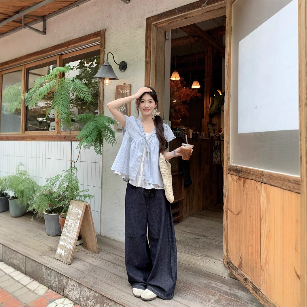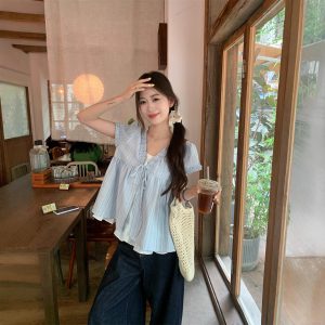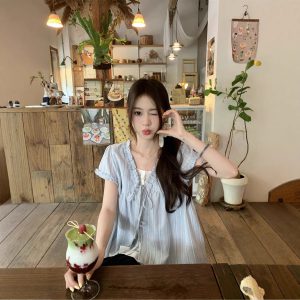 Real shot of summer necklace, lace-up, blue striped fake two-piece short-sleeved shirt