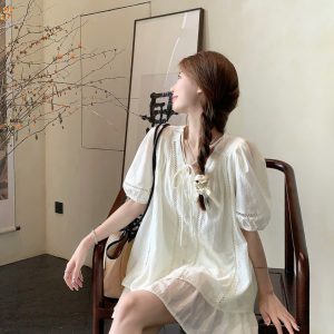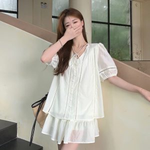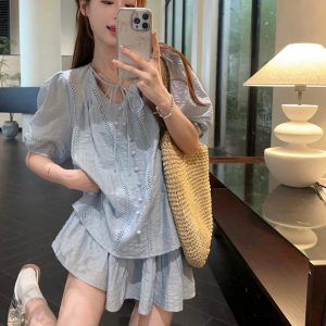 Real shot~ Summer loose and versatile short-sleeved shirt top elastic waist wide-leg short skirt casual suit