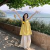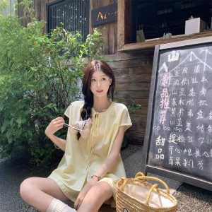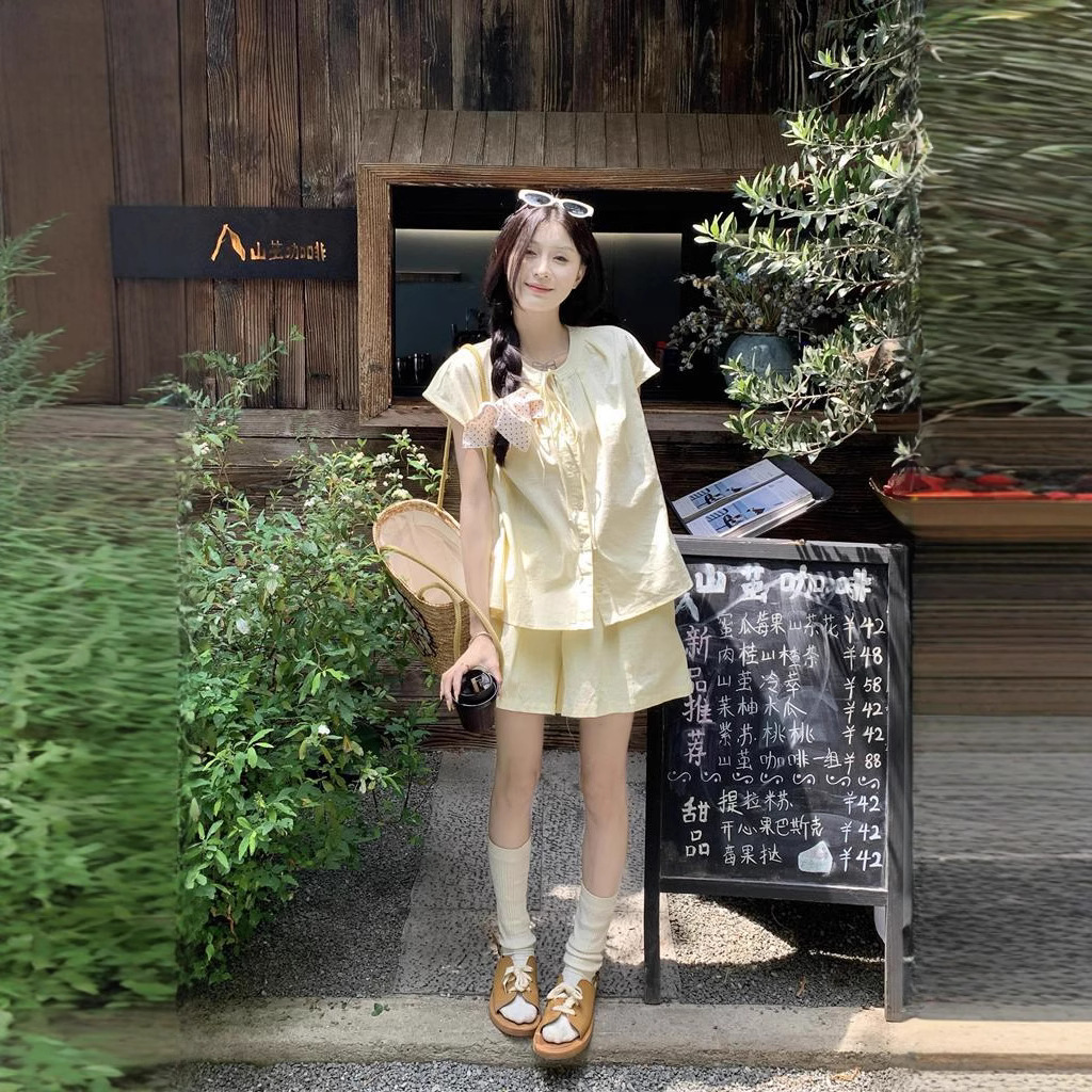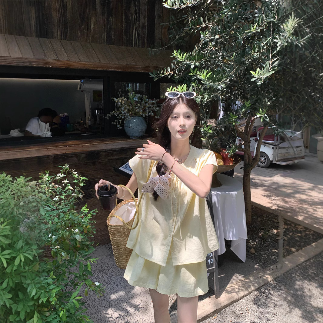 Real shot~ Sweet Korean style loose lace-up short sleeve shirt wide-leg shorts small fashion suit