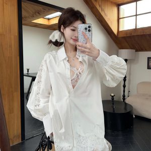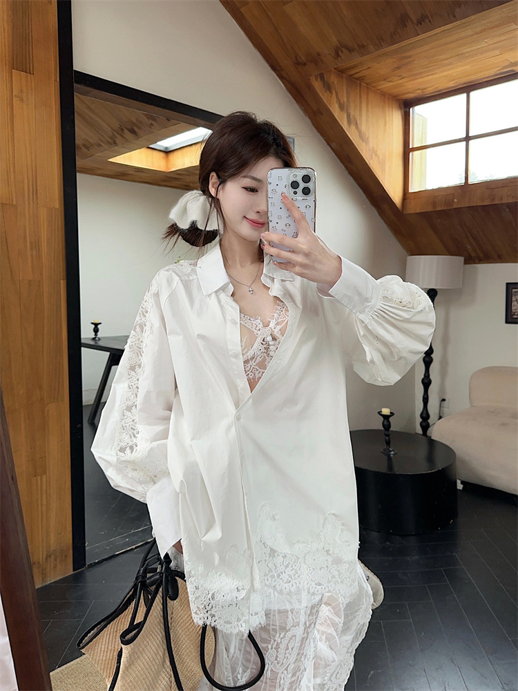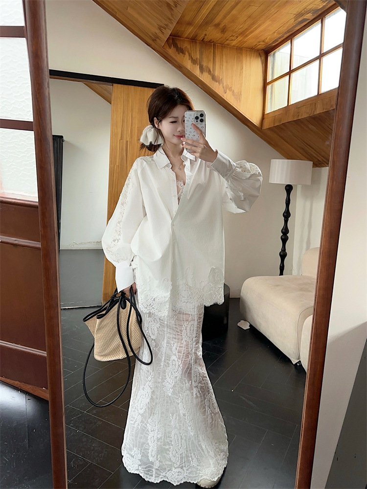 Real shot~Design-sensual lace spliced long-sleeved shirt for women + lace underwear + high-waisted skirt three-piece set