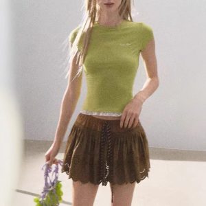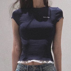 / “See yourself to make peace” Lace skin-friendly, antibacterial slimming tight short-sleeved shirt top