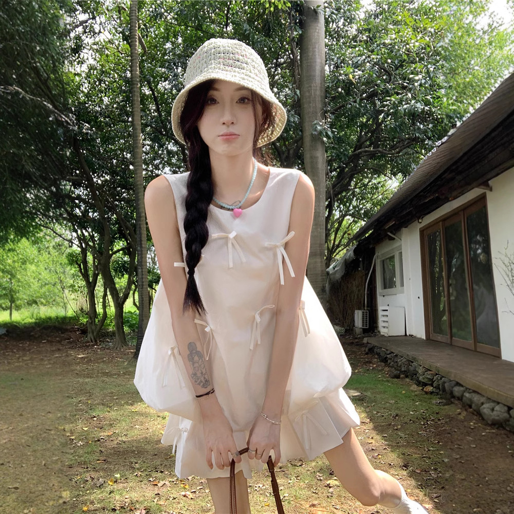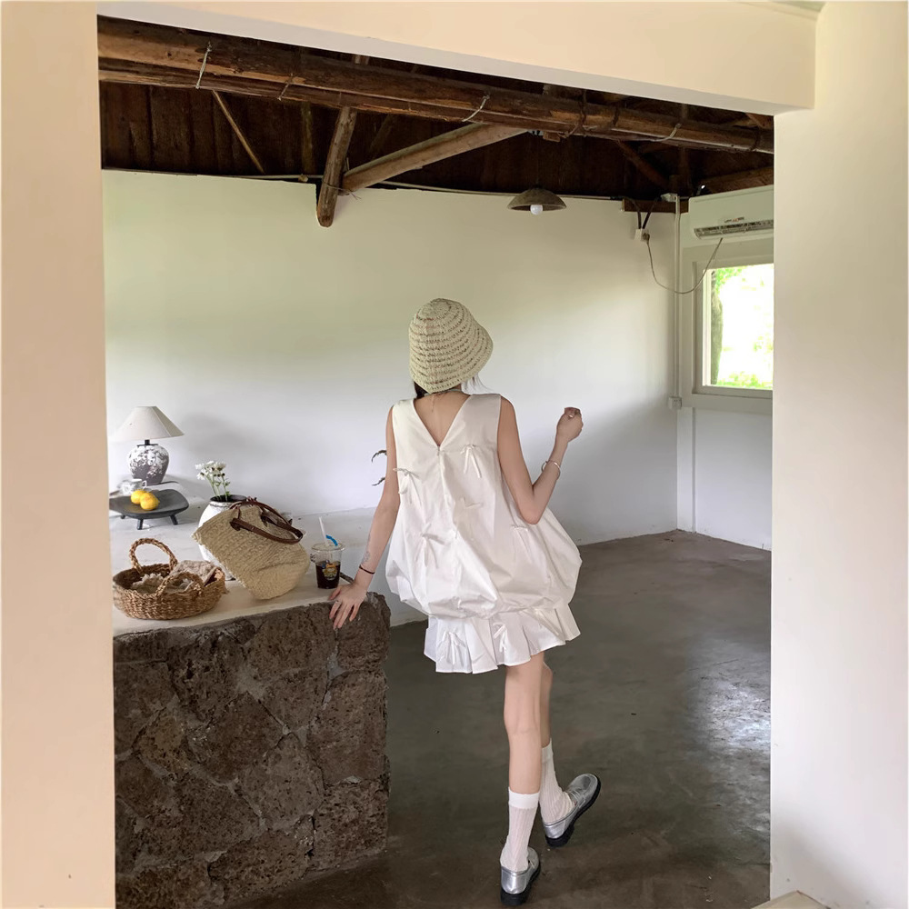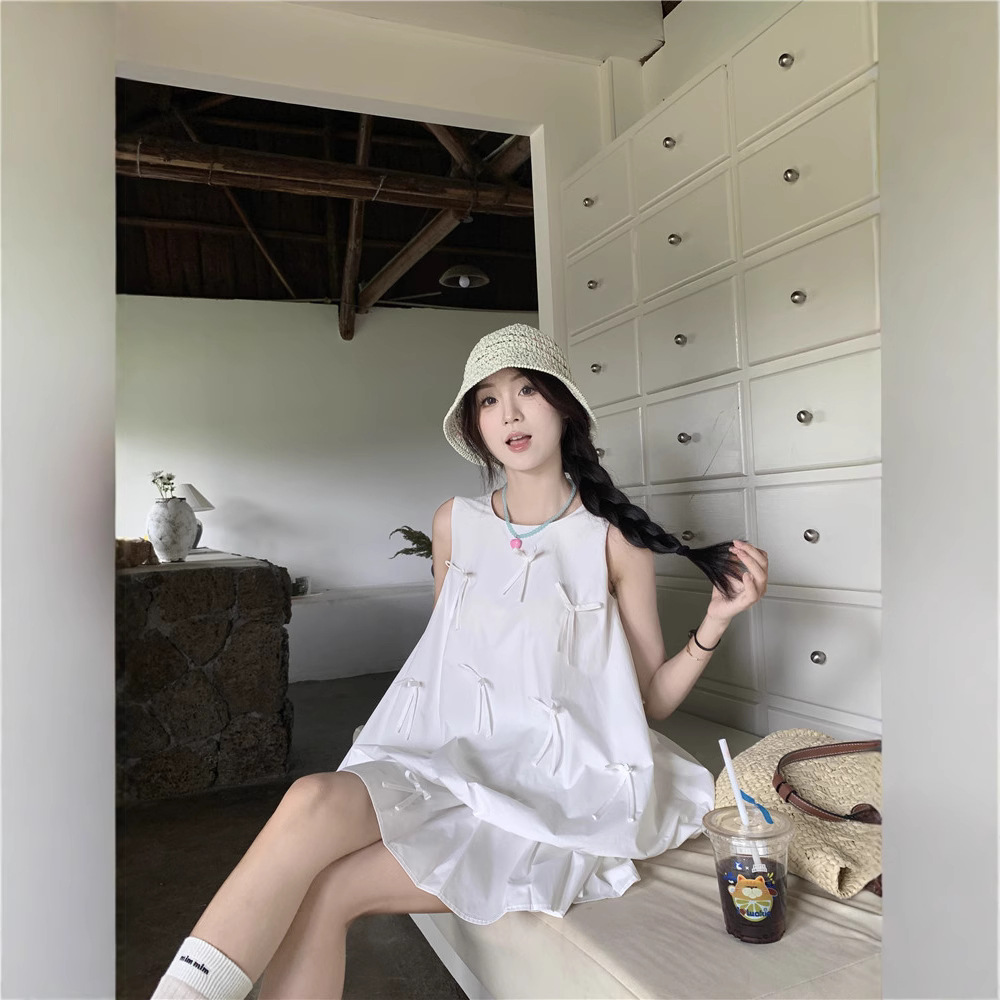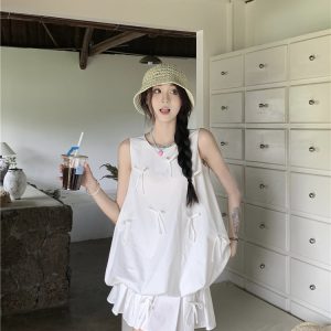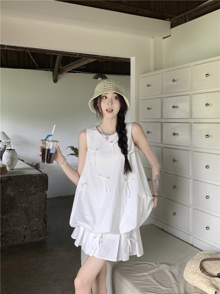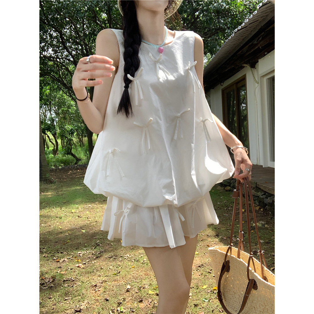 Summer three-dimensional bow and flower bud vest top white pleated skirt women’s fashion suit
