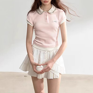 Sunset Park Pink, blue and gray spliced ​​fake two-piece rhinestone collar short-sleeved stretch-shirt top