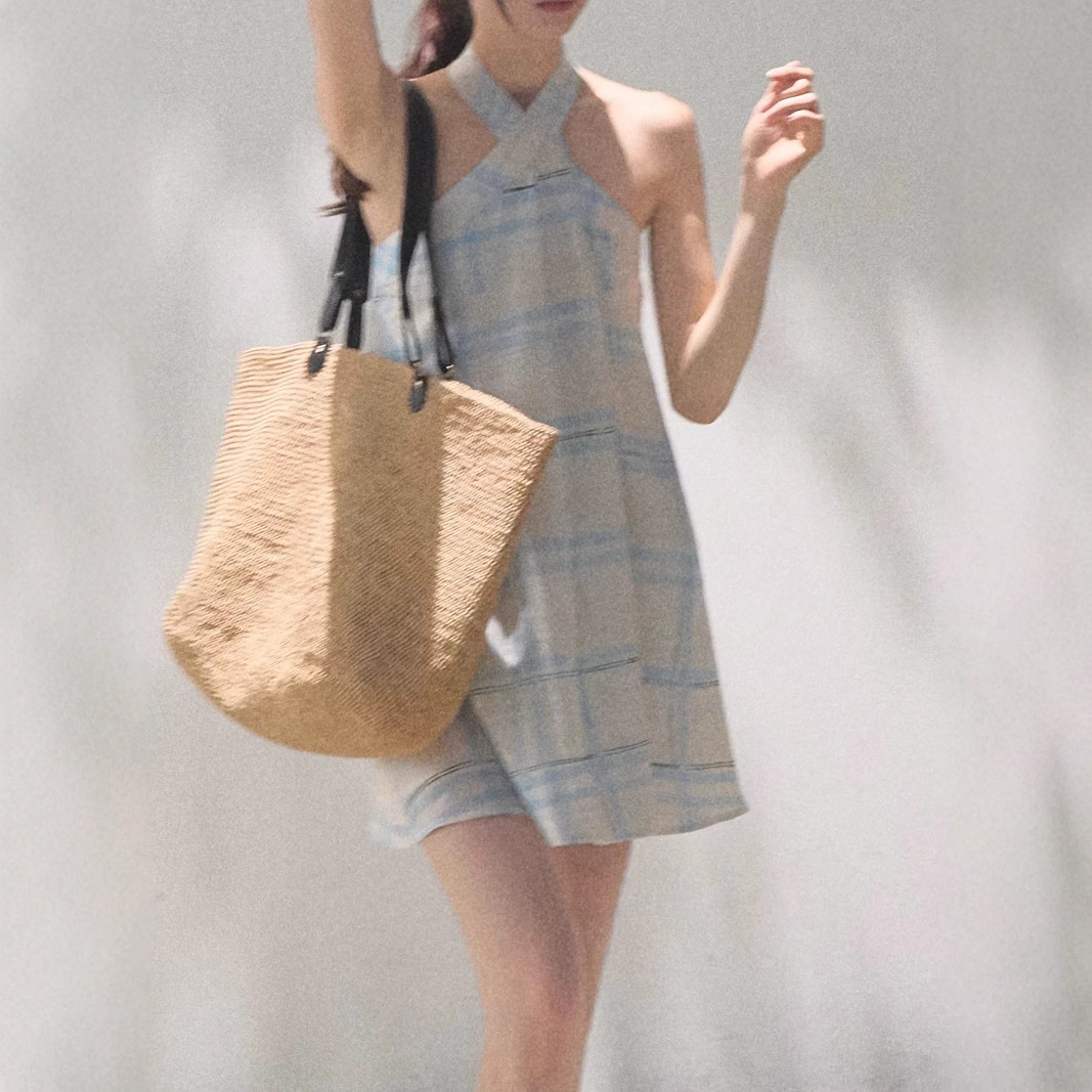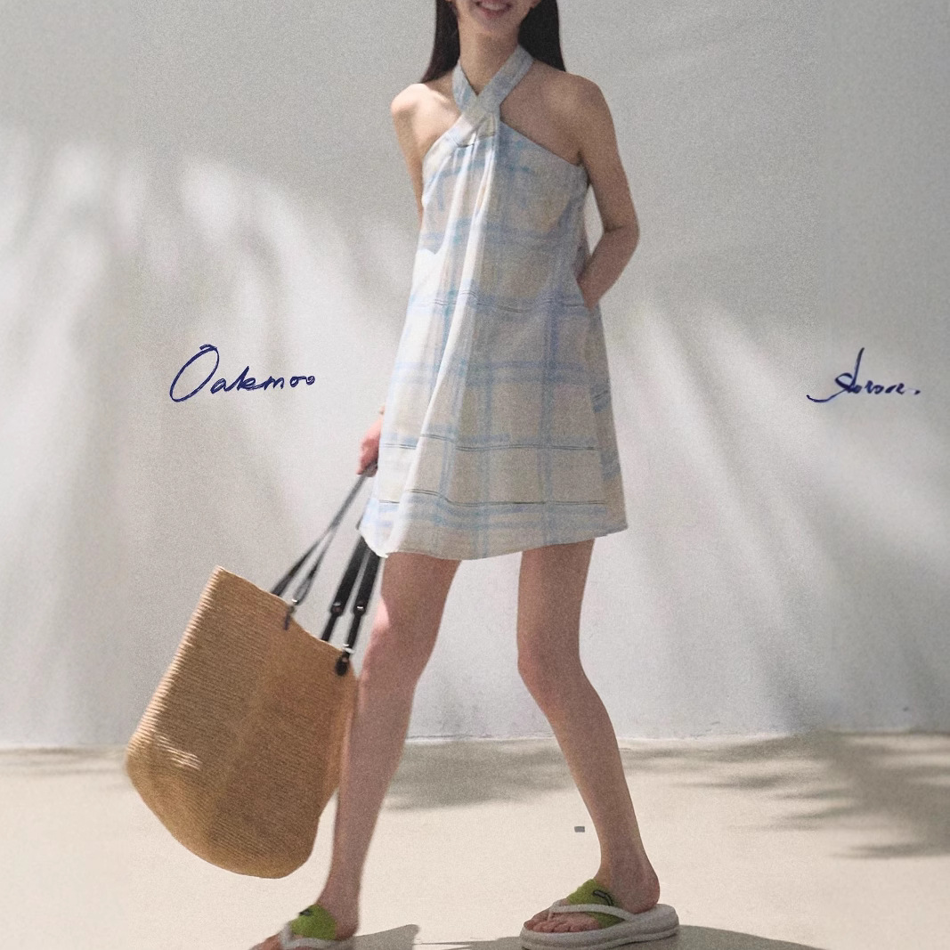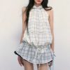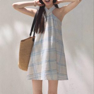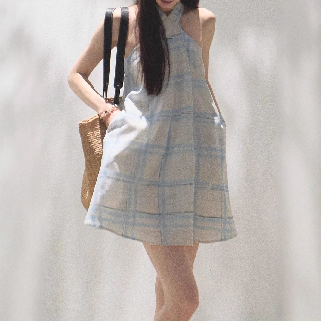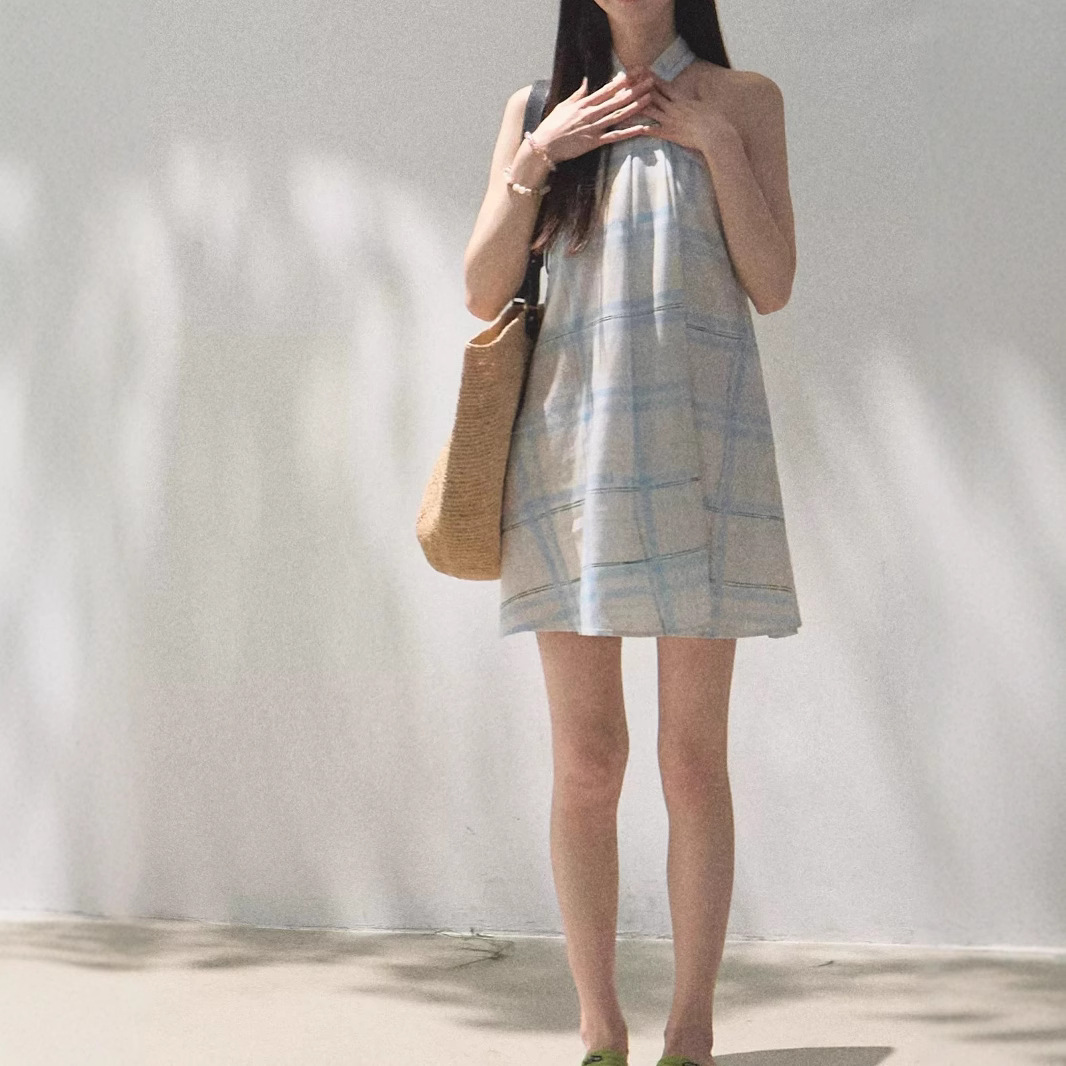 *The breath of rain, the skin-friendly and fresh plaid neck halter dress