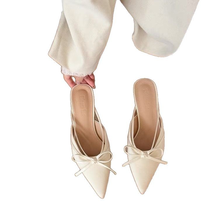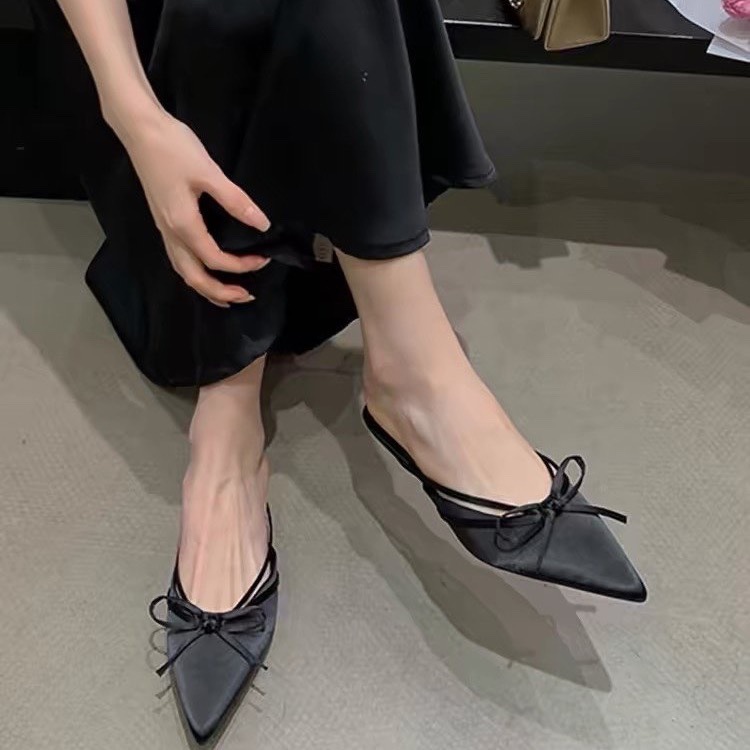 Thick heel bow bag half slipper fairy shoes spring and summer satin French temperament half-scroll single shoes