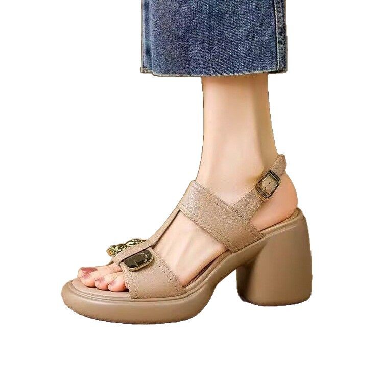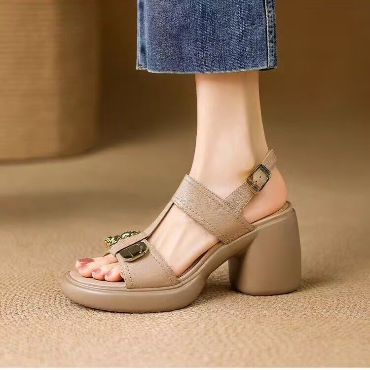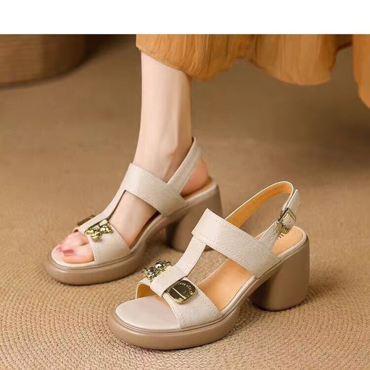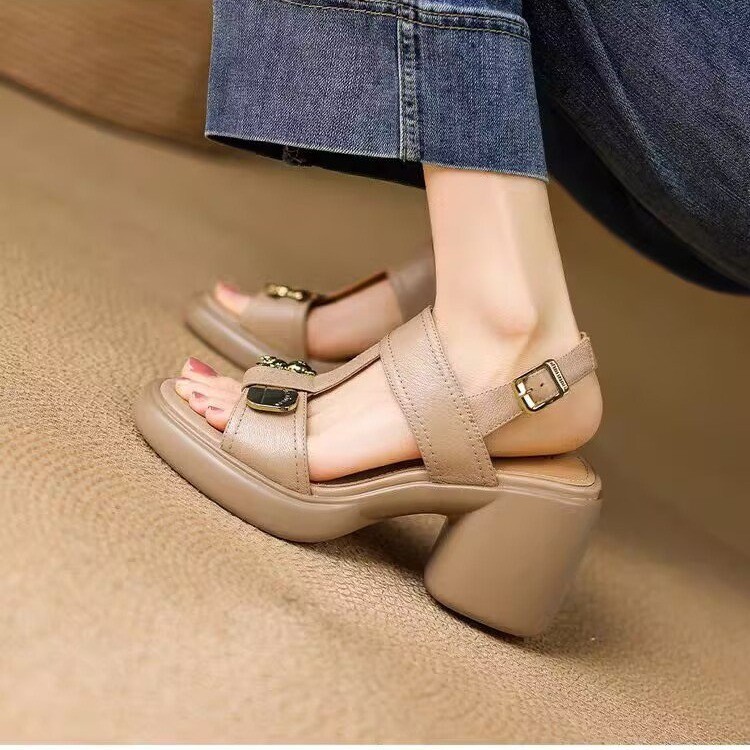 Thick heel sandals for women in summer soft leather high heels casual simple thick sole small height-enhancing shoes