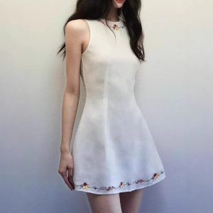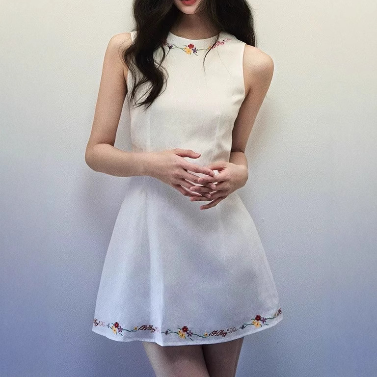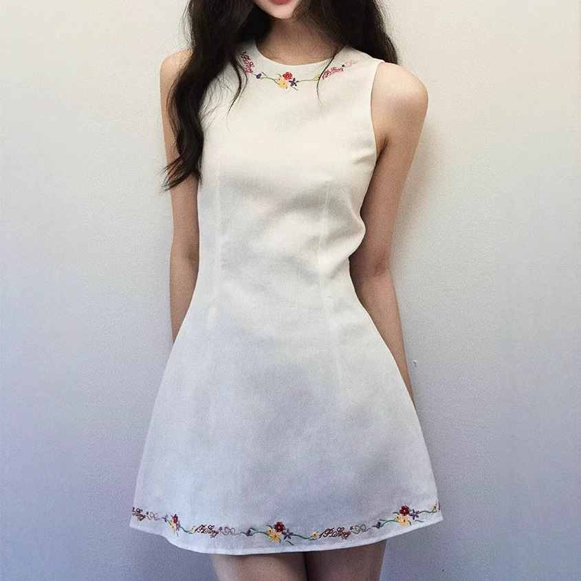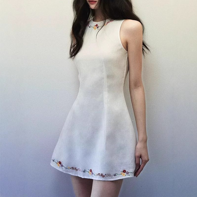White linen embroidered vest dress for women in spring and summer shoulder-cut design waist-hugging sleeveless short skirt